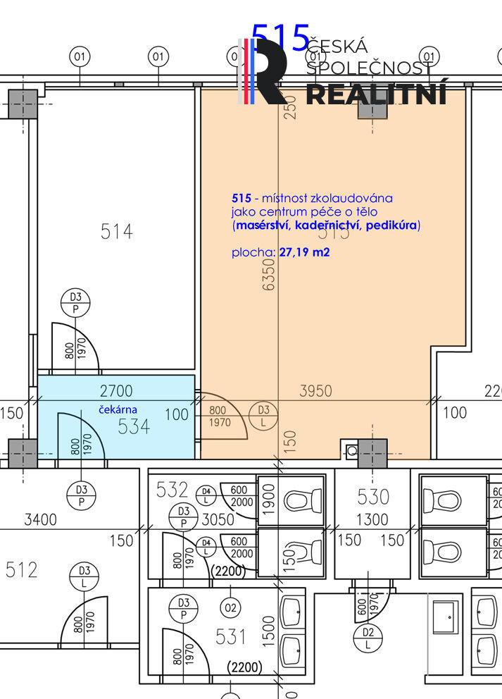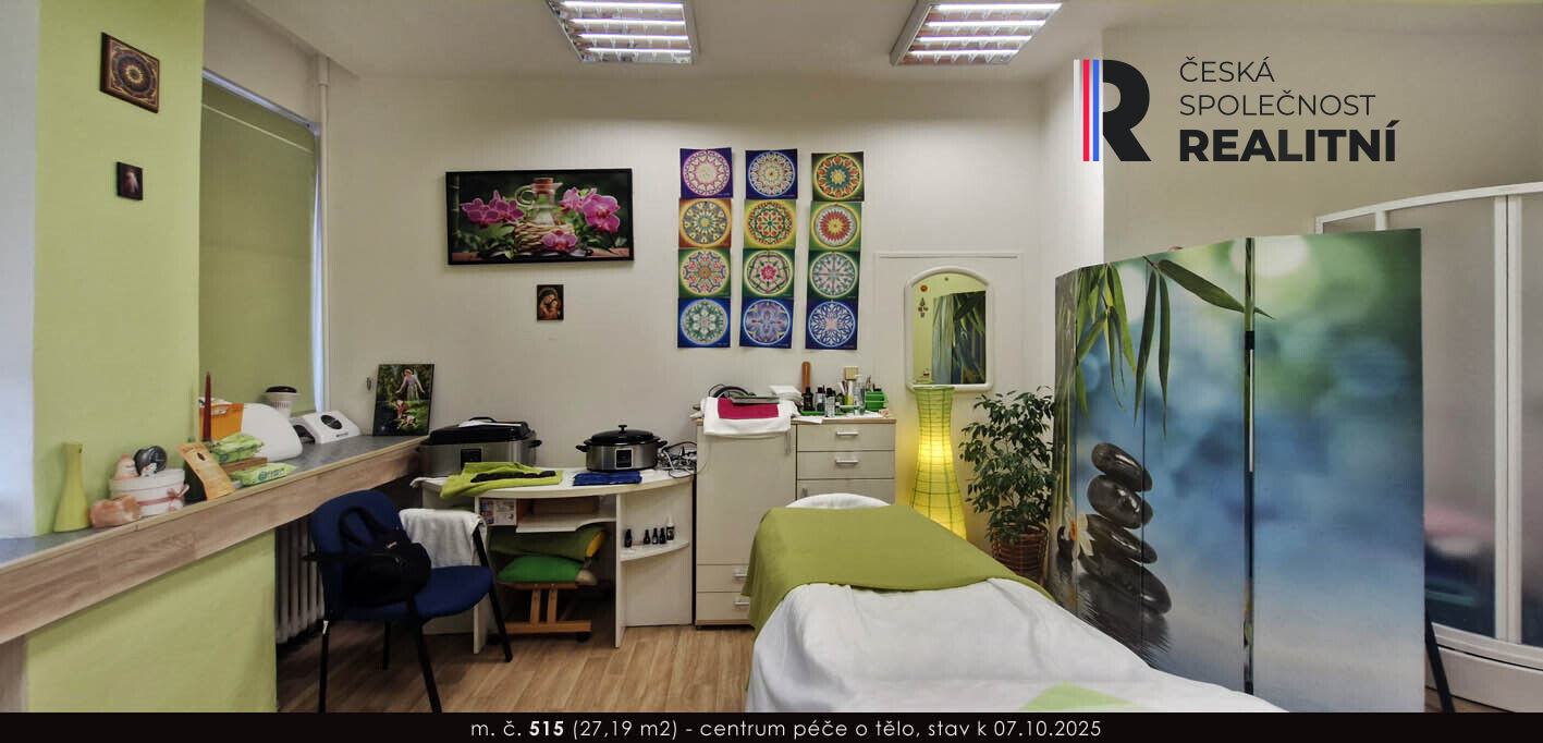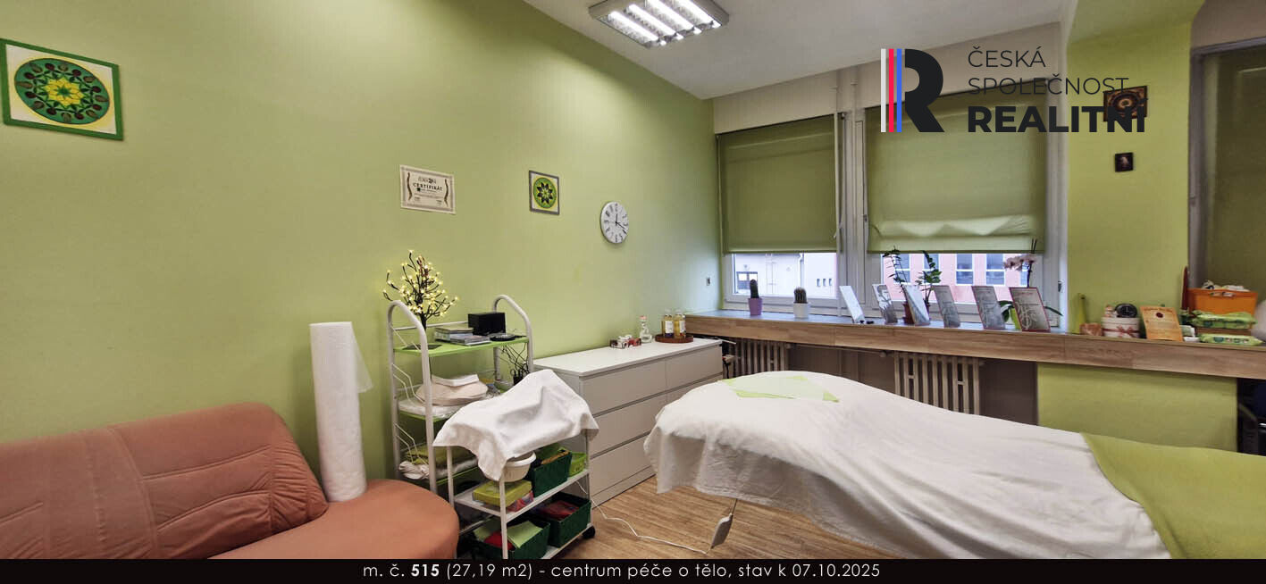 Místnost je zkolaudována jako "provozovna péče o tělo", v místnosti je k dispozici umyvadlo a sprchový box. Místnost je tedy vhodná pro provoz masérství, kadeřnictví, pedikúra, manikúra.