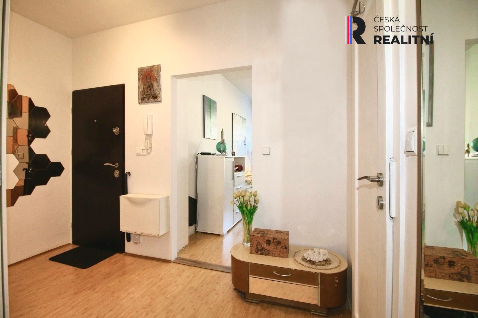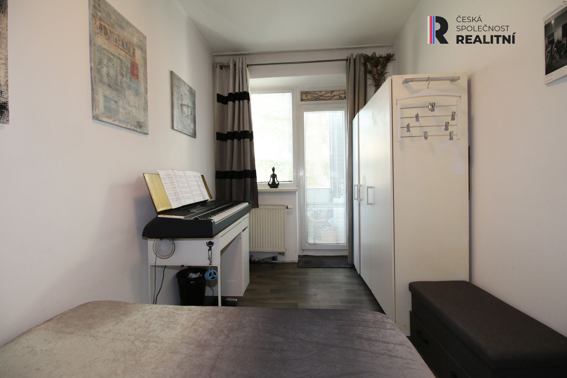 Masivními bezpečnostními dveřmi vejdete do předsíně s prostornou šatní skříní. Odtud potom do obývacího pokoje s kuchyňským koutem ( 21m2 ) a výhledem do ul. Merhautova. Ložnice je samostatná ( 10m2 ), neprůchozí s lodžií, situovaná s výhledem do klidného dvorního traktu se zelení. V koupelně je vana, WC.
