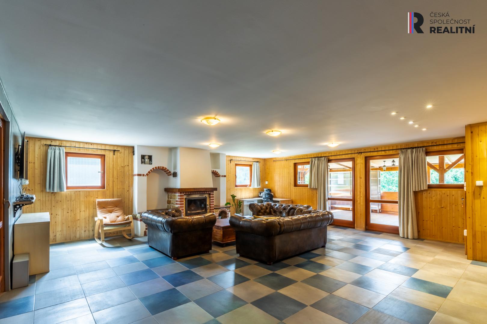 -Prostorný obývací pokoj s krbem – spojení domova a společenského prostoru.