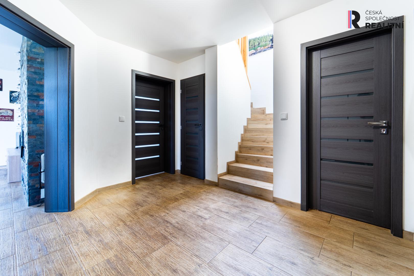 V patře najdete dvě ložnice s nádherným výhledem do okolní krajiny. Nechybí ani praktická šatna, kterou je možné dle potřeby přestavět na třetí pokoj. Součástí patra je také hlavní koupelna, která nabízí vše potřebné pro pohodlí každodenního života, rohovou vanu, umyvadlo se zrcadlem, skříňky a místo pro pračku.