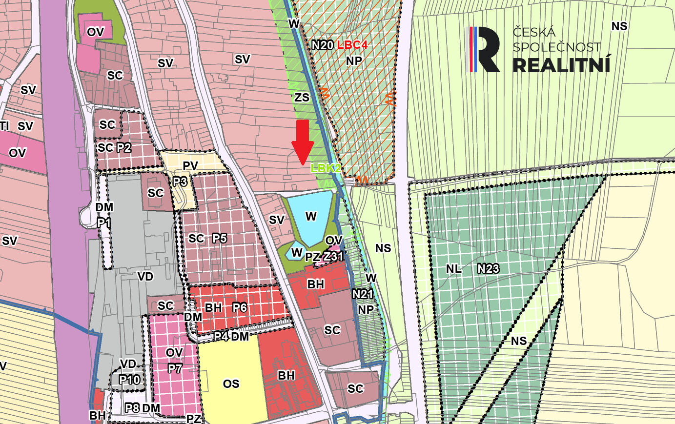 Část pozemku je v zóně územního plánu SV - plochy smíšené obytné venkovské, část v zóně ZS - sídelní zeleň ( viz výkres ÚP ).