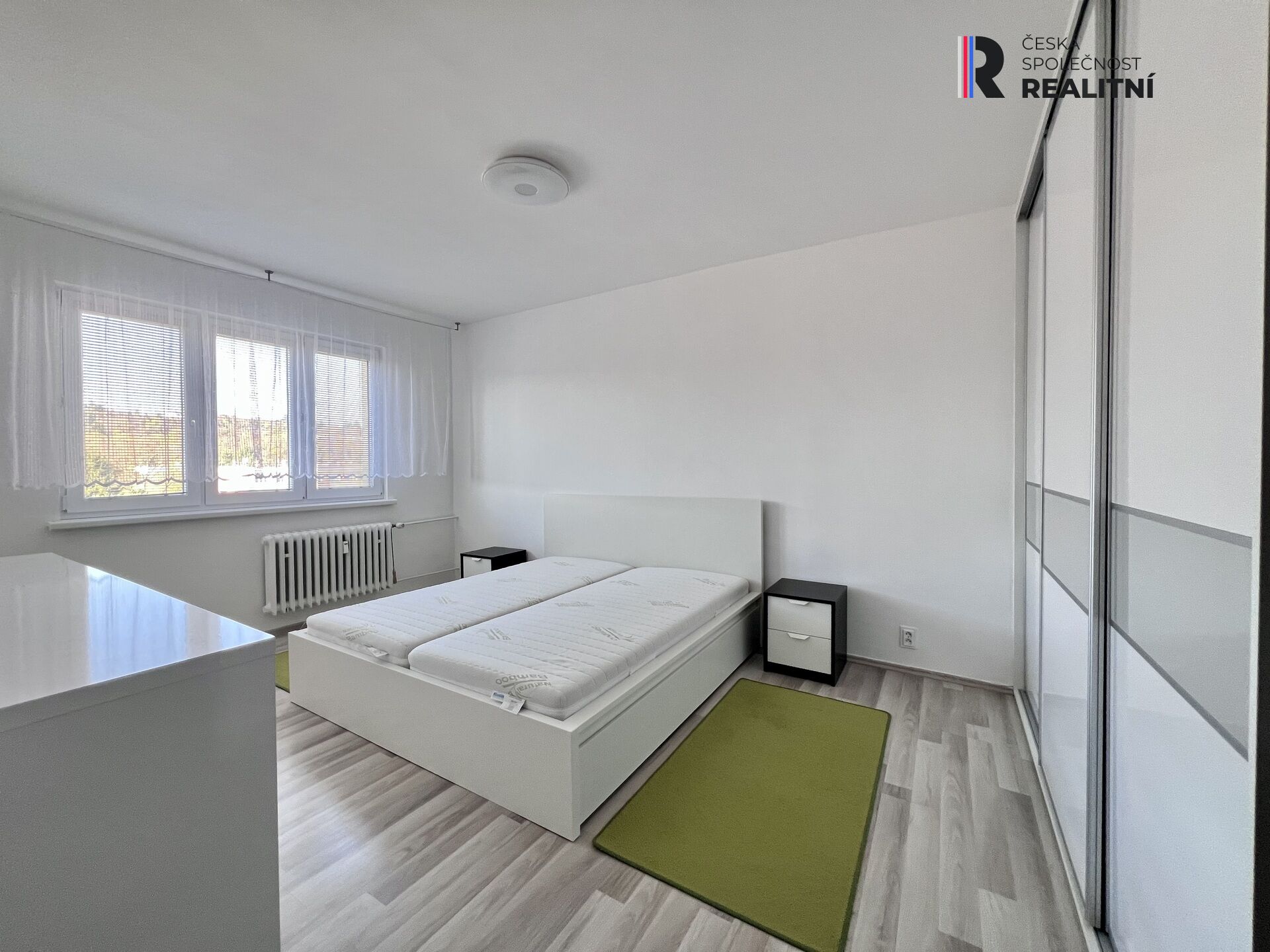 V ložnici dominuje manželská postel s komodou a také velká vestavěná skříň.